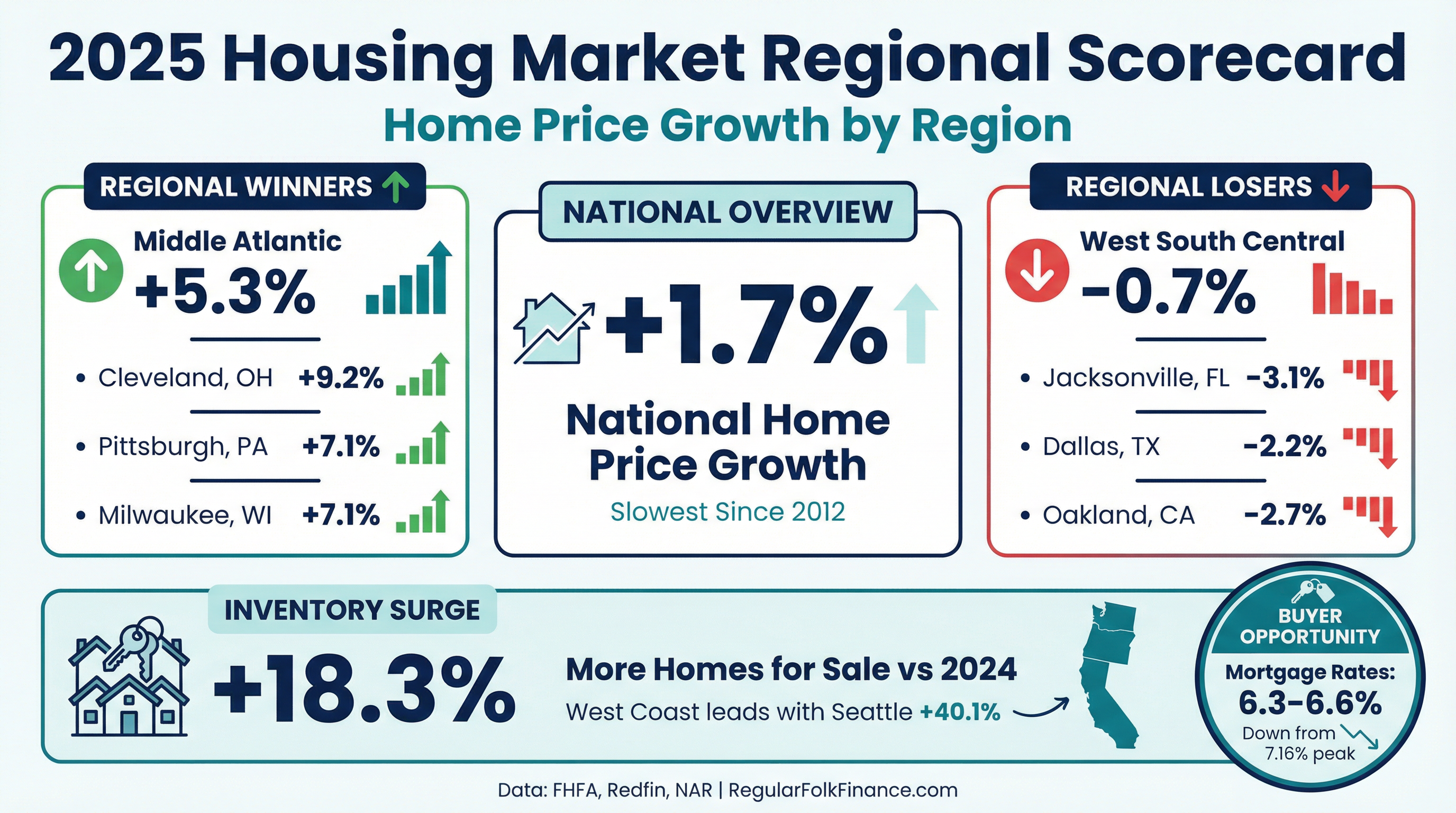 | Region / Metro | 12-Month Home Price Change | |---|---| | Top Performers | | | Middle Atlantic Region | +5.3% | | Cleveland, OH | +9.2% | | Pittsburgh, PA | +7.1% | | Milwaukee, WI | +7.1% | | Bottom Performers | | | West South Central Region | -0.7% | | Jacksonville, FL | -3.1% | | Dallas, TX | -2.2% | | Oakland, CA | -2.7% |
