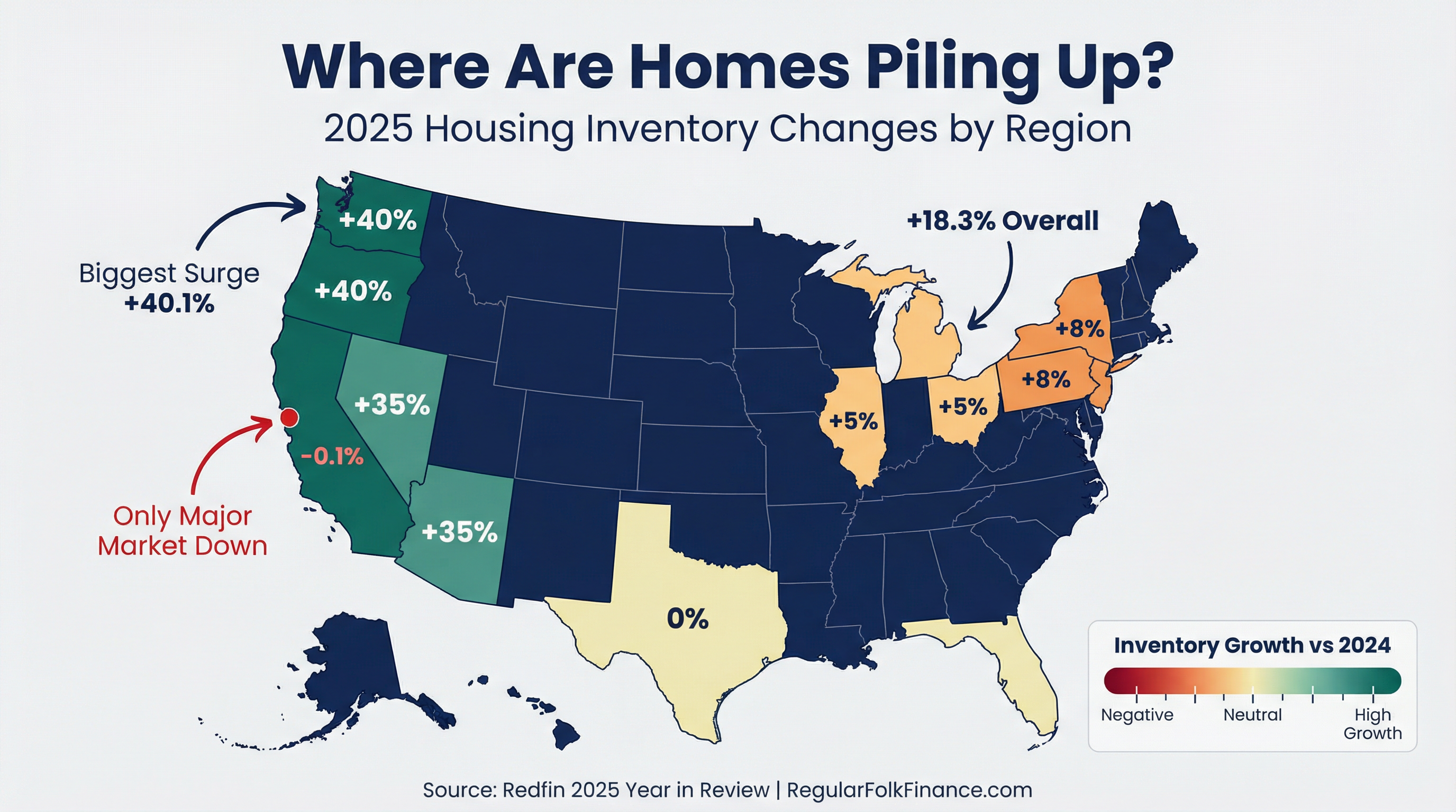 The 18.3% jump in housing inventory is one of the most significant statistics of 2025, but it comes with a major catch. The increase isn't uniform. In pricey coastal markets that saw a mass exodus during the pandemic, inventory has come roaring back. Seattle saw a massive 40.1% increase in homes for sale, with other West Coast cities like Las Vegas (+38.0%), Anaheim (+36.7%), and Oakland (+35.4%) close behind.